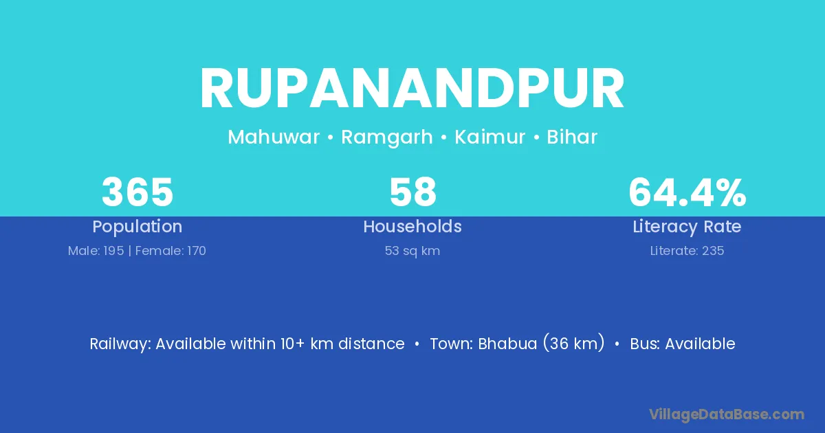 Bhabua (36 km) is the nearest town to Rupanandpur village for major economic activities and is located approximately 36 km away.