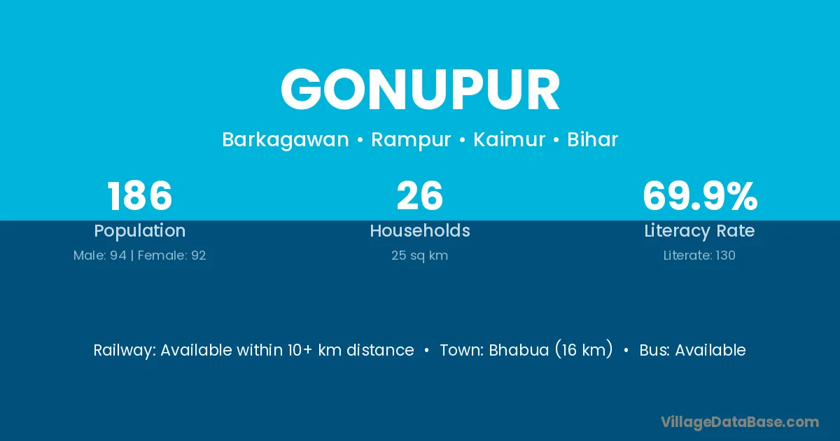 Bhabua (16 km) is the nearest town to Gonupur village for major economic activities and is located approximately 16 km away.