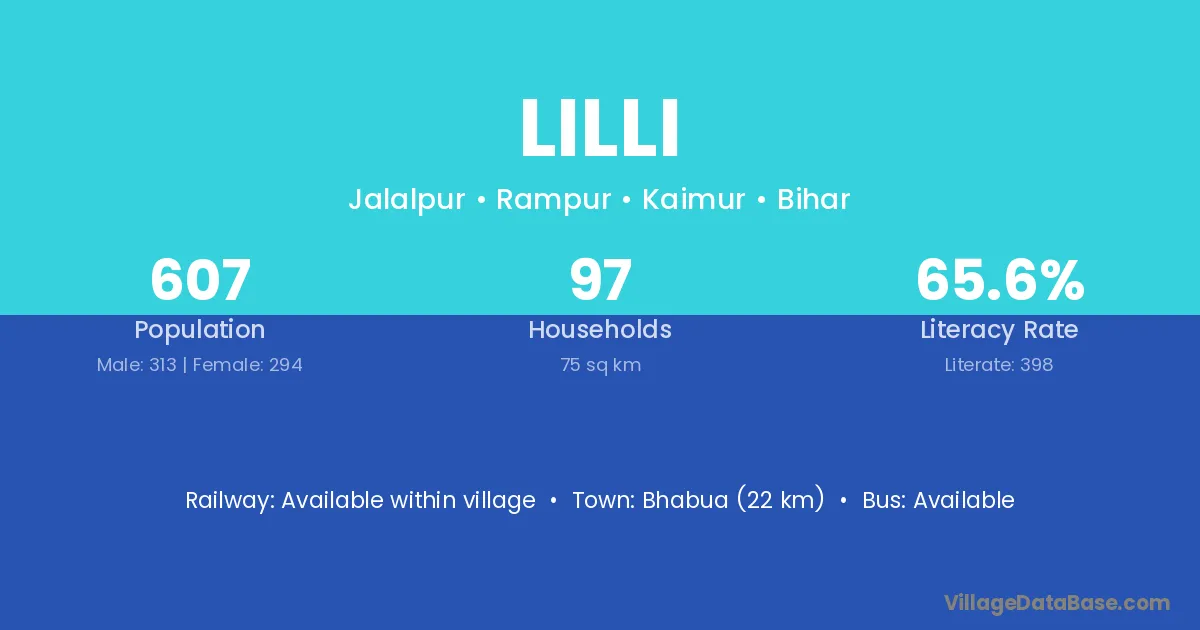 Bhabua (22 km) is the nearest town to Lilli village for major economic activities and is located approximately 22 km away.