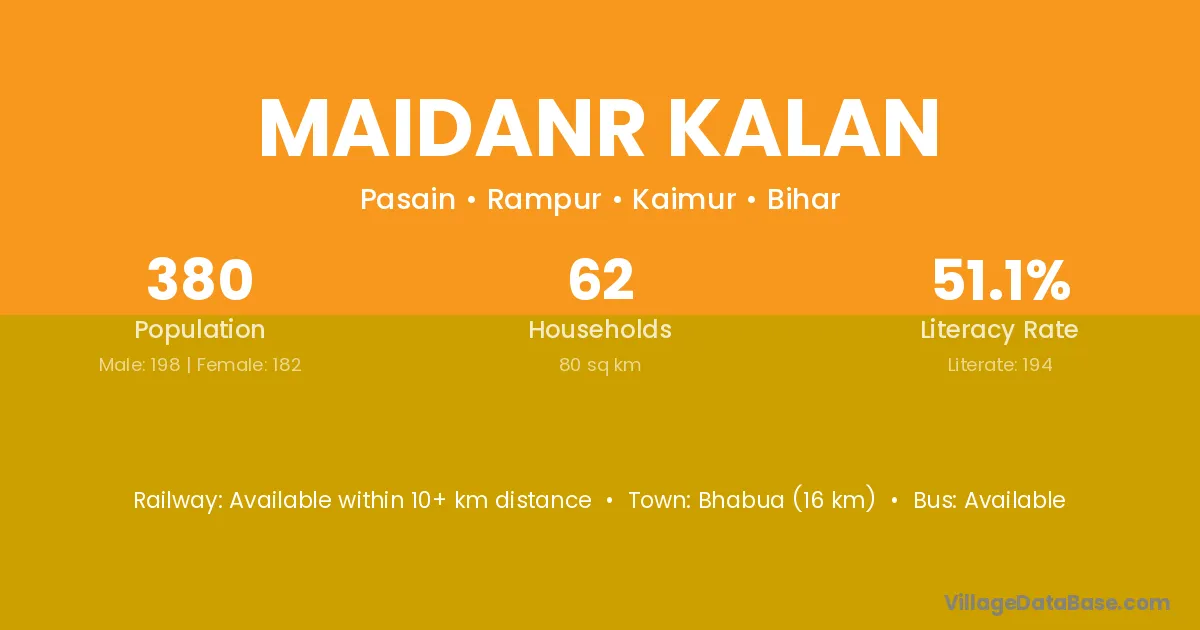 Bhabua (16 km) is the nearest town to Maidanr Kalan village for major economic activities and is located approximately 16 km away.