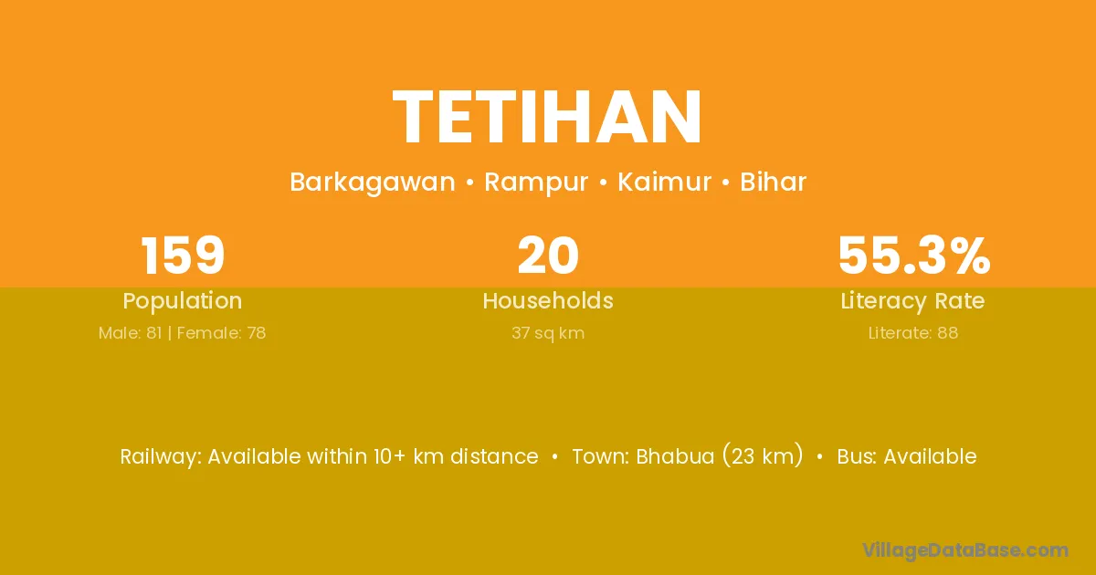 Bhabua (23 km) is the nearest town to Tetihan village for major economic activities and is located approximately 23 km away.
