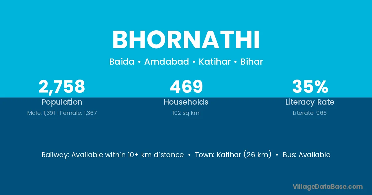Katihar (26 km) is the nearest town to Bhornathi village for major economic activities and is located approximately 26 km away.