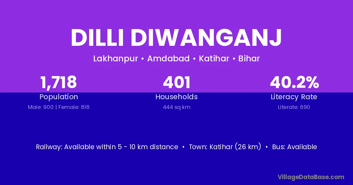Katihar (26 km) is the nearest town to Dilli Diwanganj village for major economic activities and is located approximately 26 km away.
