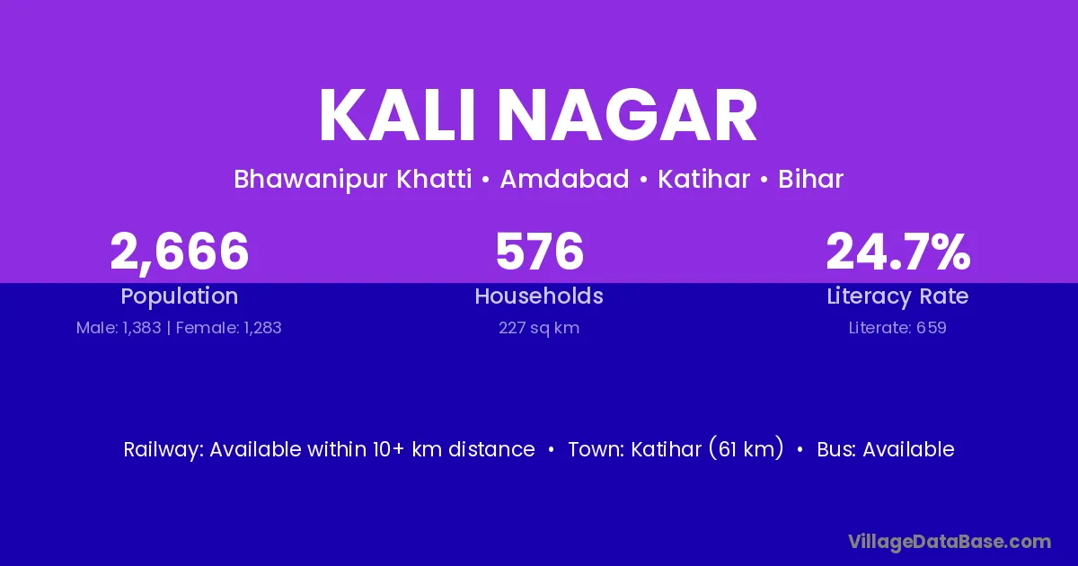 Katihar (61 km) is the nearest town to Kali Nagar village for major economic activities and is located approximately 61 km away.