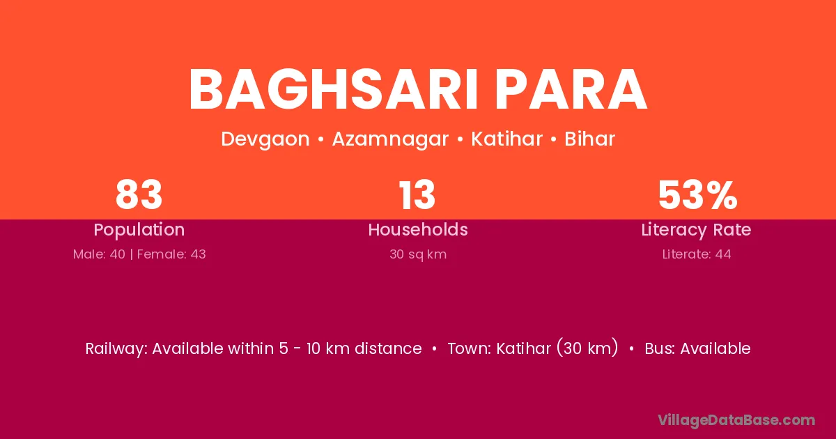 Katihar (30 km) is the nearest town to Baghsari Para village for major economic activities and is located approximately 30 km away.