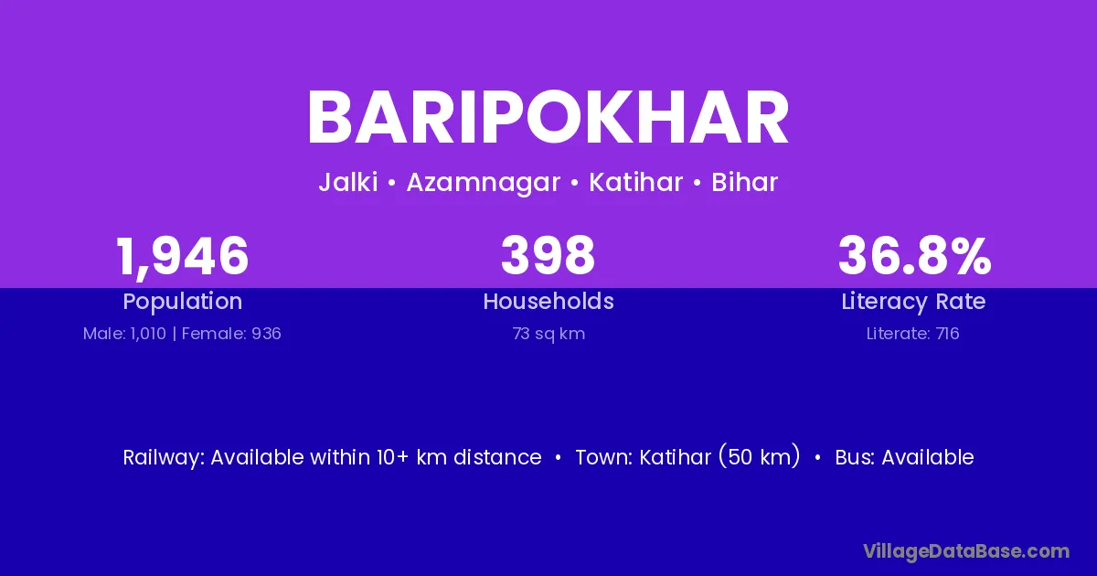 Katihar (50 km) is the nearest town to Baripokhar village for major economic activities and is located approximately 50 km away.
