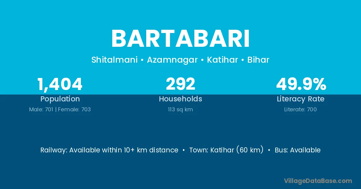 Katihar (60 km) is the nearest town to Bartabari village for major economic activities and is located approximately 60 km away.