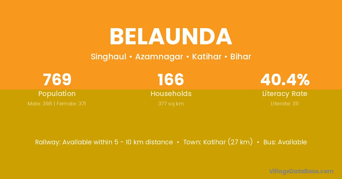 Katihar (27 km) is the nearest town to Belaunda village for major economic activities and is located approximately 27 km away.