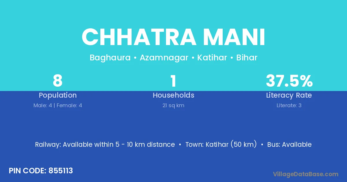 Katihar (50 km) is the nearest town to Chhatra Mani village for major economic activities and is located approximately 50 km away.