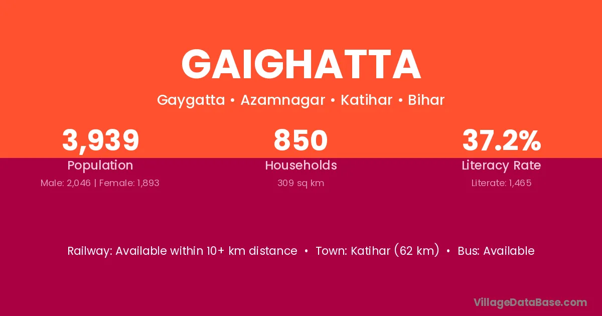 Katihar (62 km) is the nearest town to Gaighatta village for major economic activities and is located approximately 62 km away.