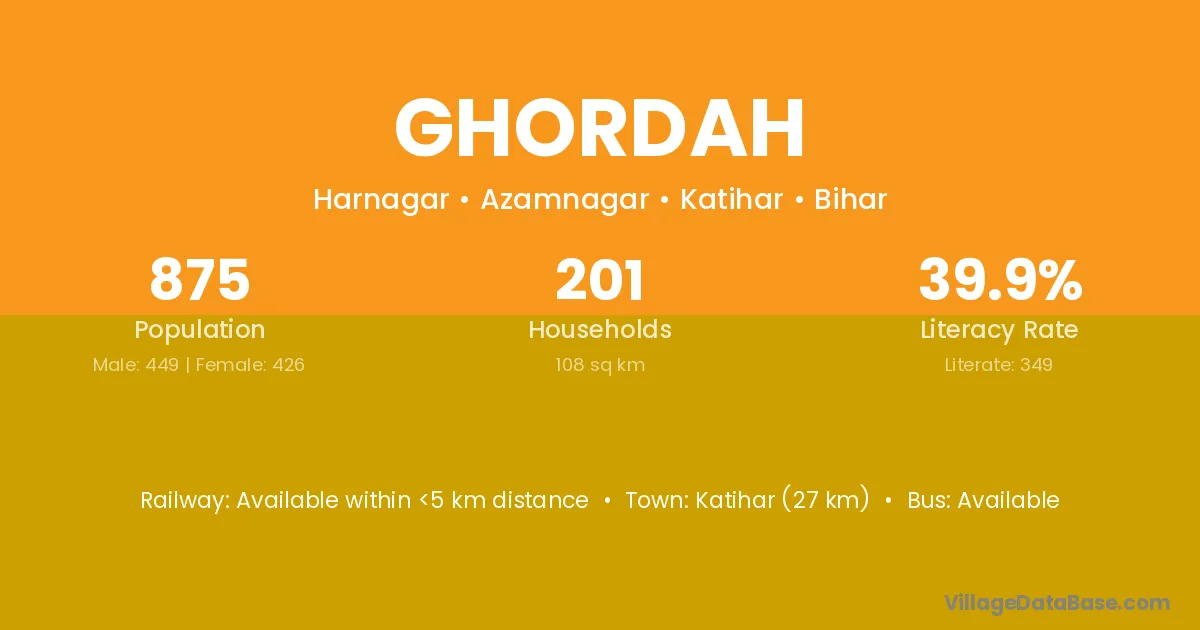 Katihar (27 km) is the nearest town to Ghordah village for major economic activities and is located approximately 27 km away.