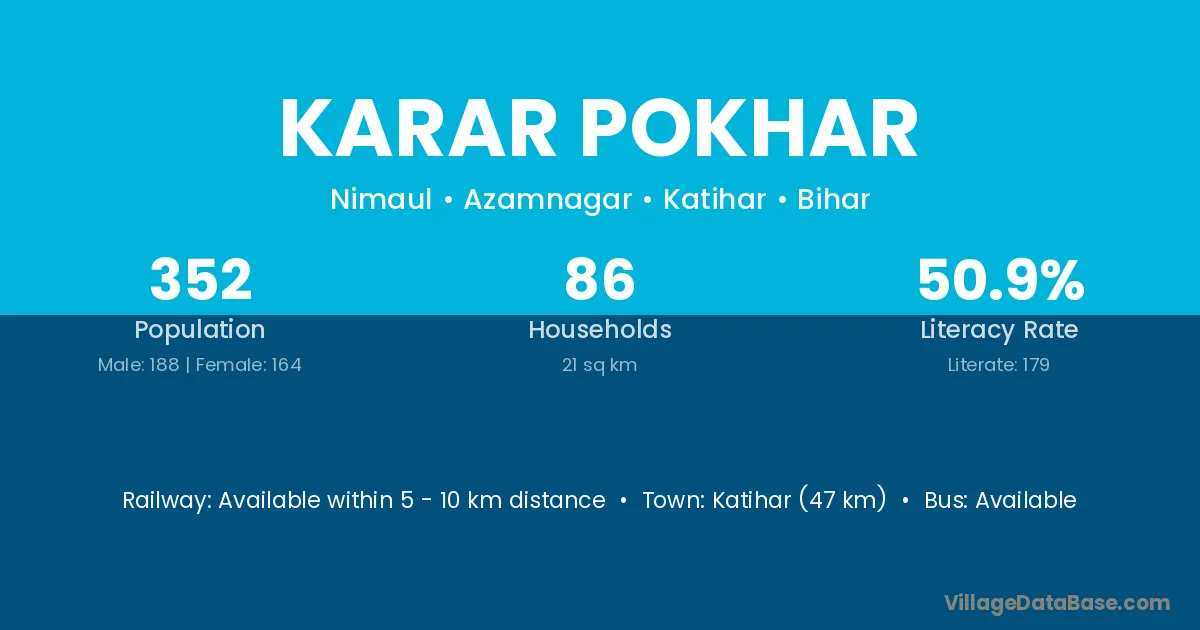 Katihar (47 km) is the nearest town to Karar Pokhar village for major economic activities and is located approximately 47 km away.