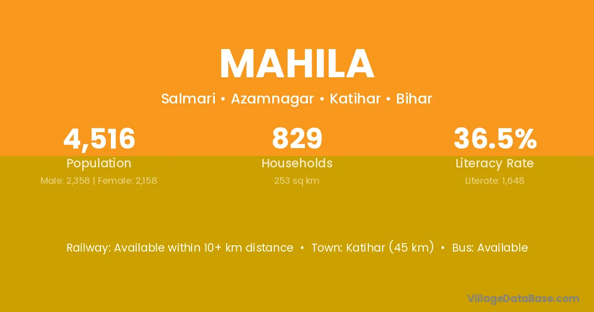 Katihar (45 km) is the nearest town to Mahila village for major economic activities and is located approximately 45 km away.