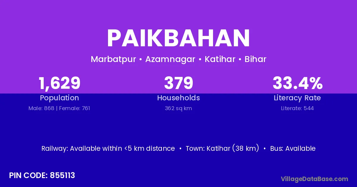 Katihar (38 km) is the nearest town to Paikbahan village for major economic activities and is located approximately 38 km away.