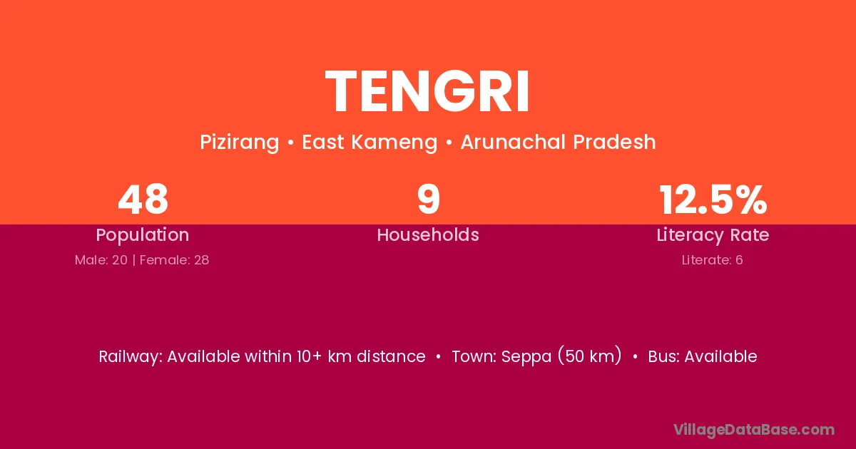 The literacy rate of Tengri village is 34.65%. Male literacy stands at 36.99% and female literacy at 32.48%.