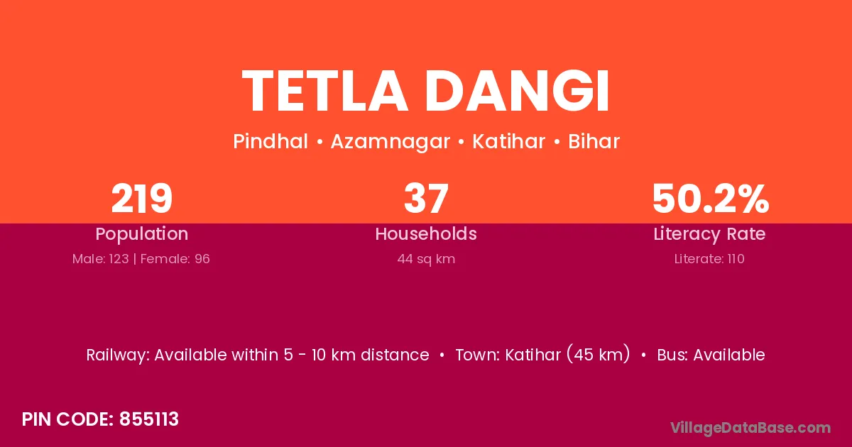 Katihar (45 km) is the nearest town to Tetla Dangi village for major economic activities and is located approximately 45 km away.