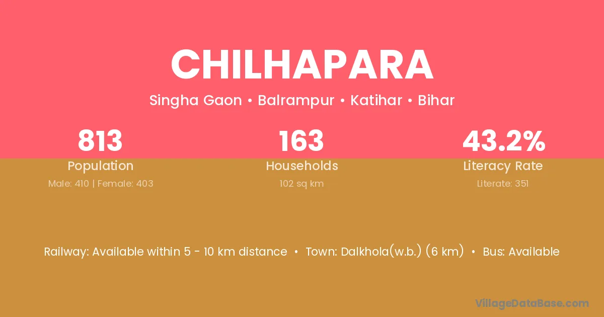 Dalkhola(w.b.) (6 km) is the nearest town to Chilhapara village for major economic activities and is located approximately 6 km away.
