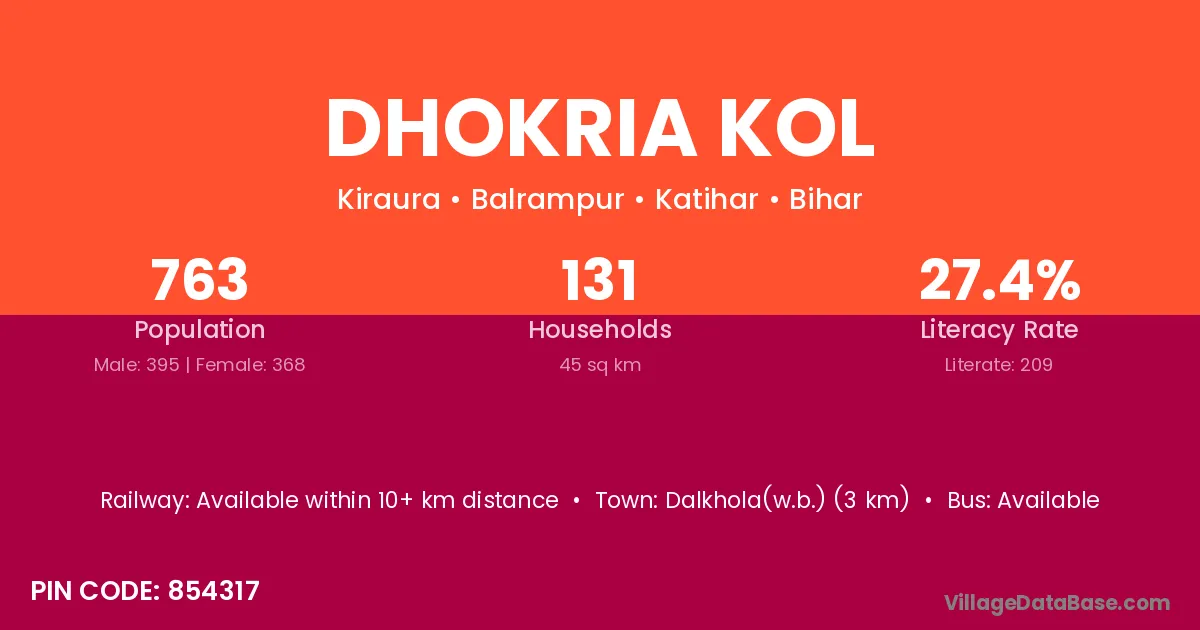 Dhokria Kol village has a total population of 763 people, of which 395 are males and 368 are females.