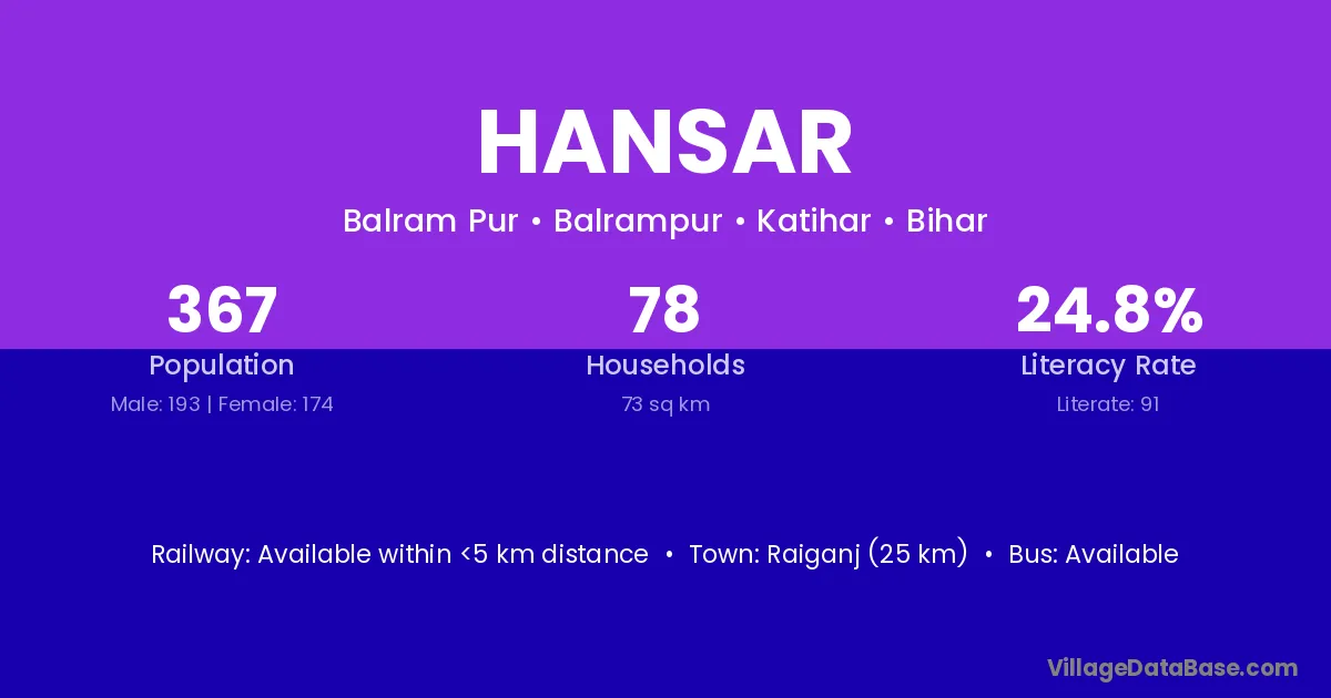 Raiganj (25 km) is the nearest town to Hansar village for major economic activities and is located approximately 25 km away.