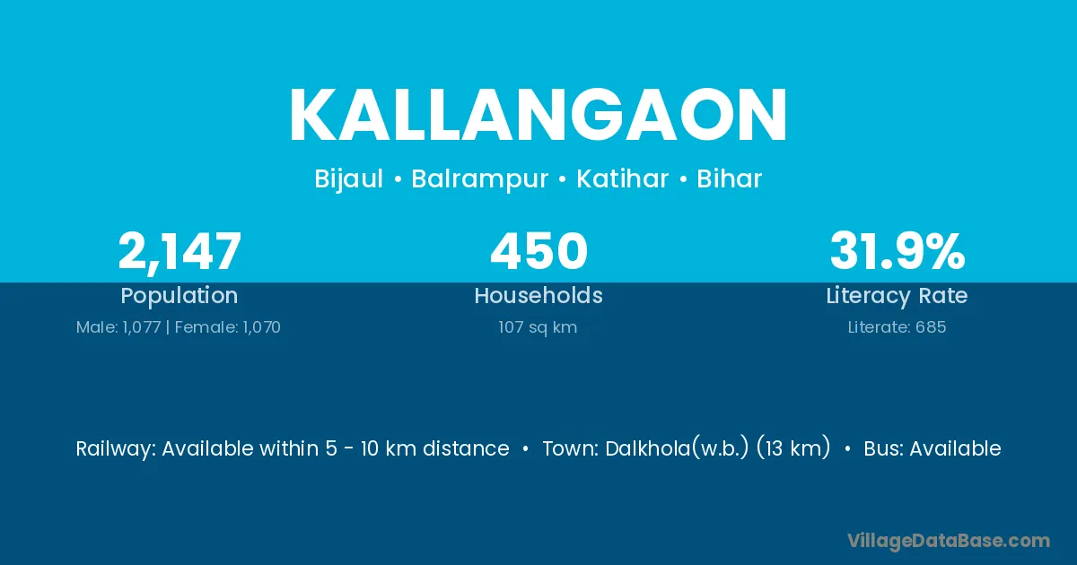 Dalkhola(w.b.) (13 km) is the nearest town to Kallangaon village for major economic activities and is located approximately 13 km away.