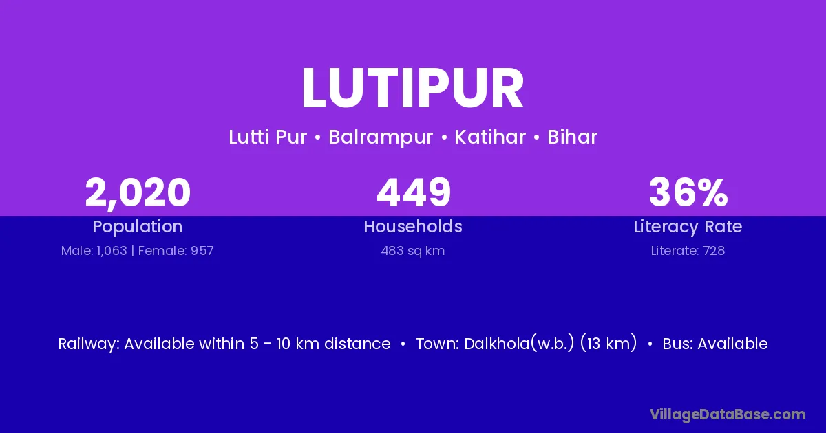 Dalkhola(w.b.) (13 km) is the nearest town to Lutipur village for major economic activities and is located approximately 13 km away.