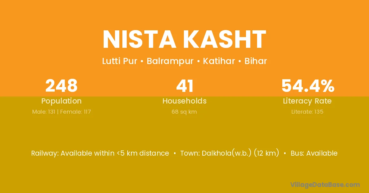 Dalkhola(w.b.) (12 km) is the nearest town to Nista Kasht village for major economic activities and is located approximately 12 km away.