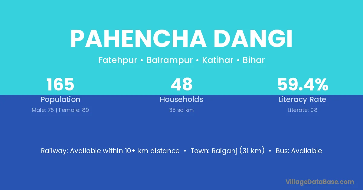 Raiganj (31 km) is the nearest town to Pahencha Dangi village for major economic activities and is located approximately 31 km away.