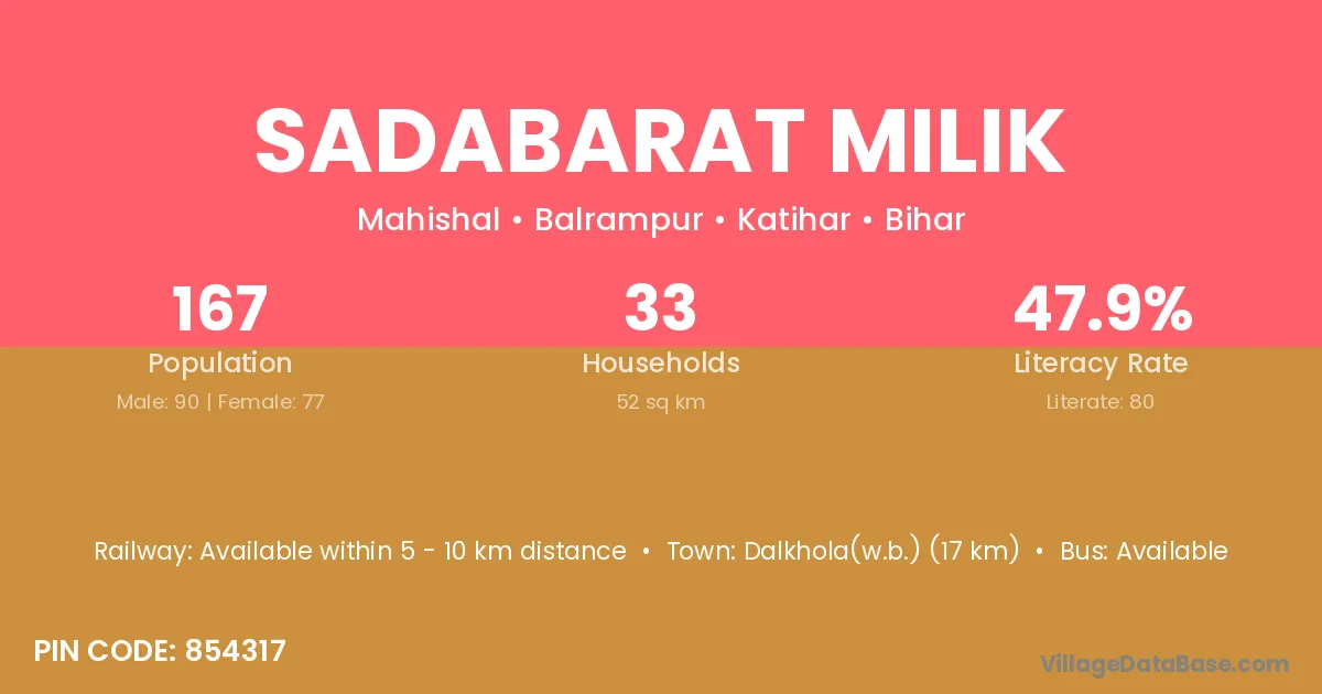 Dalkhola(w.b.) (17 km) is the nearest town to Sadabarat Milik village for major economic activities and is located approximately 17 km away.