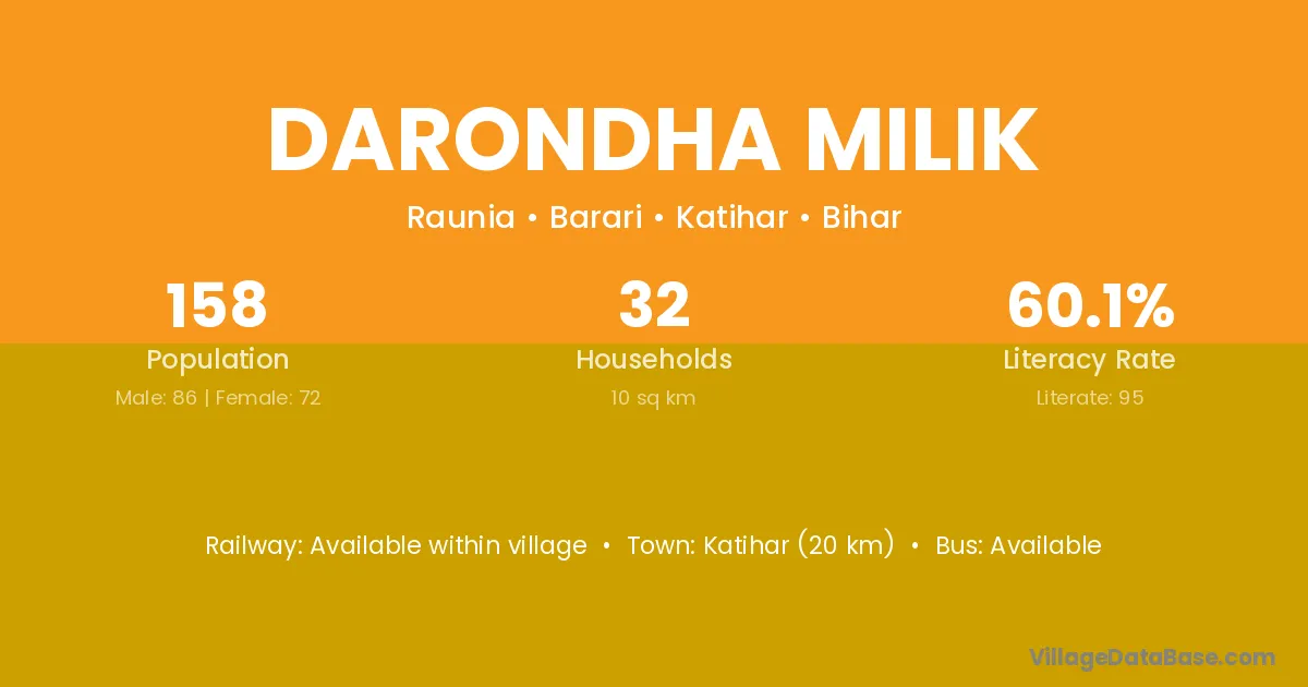 Katihar (20 km) is the nearest town to Darondha Milik village for major economic activities and is located approximately 20 km away.