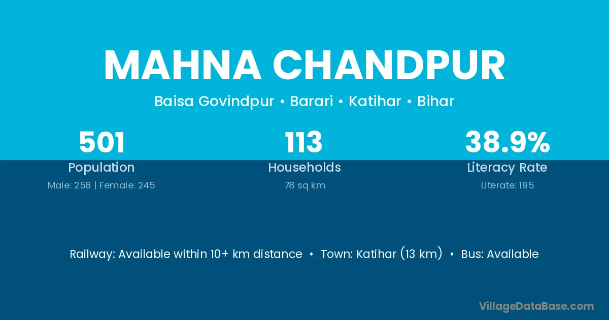 Katihar (13 km) is the nearest town to Mahna Chandpur village for major economic activities and is located approximately 13 km away.