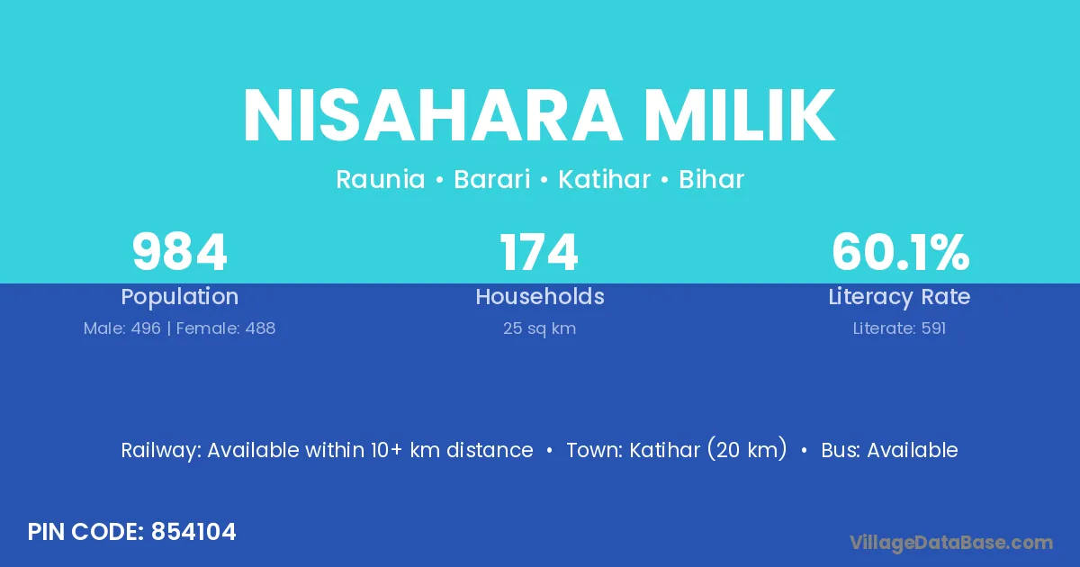 Katihar (20 km) is the nearest town to Nisahara Milik village for major economic activities and is located approximately 20 km away.