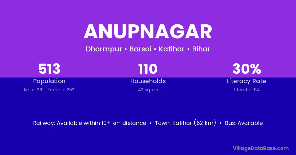 Katihar (62 km) is the nearest town to Anupnagar village for major economic activities and is located approximately 62 km away.