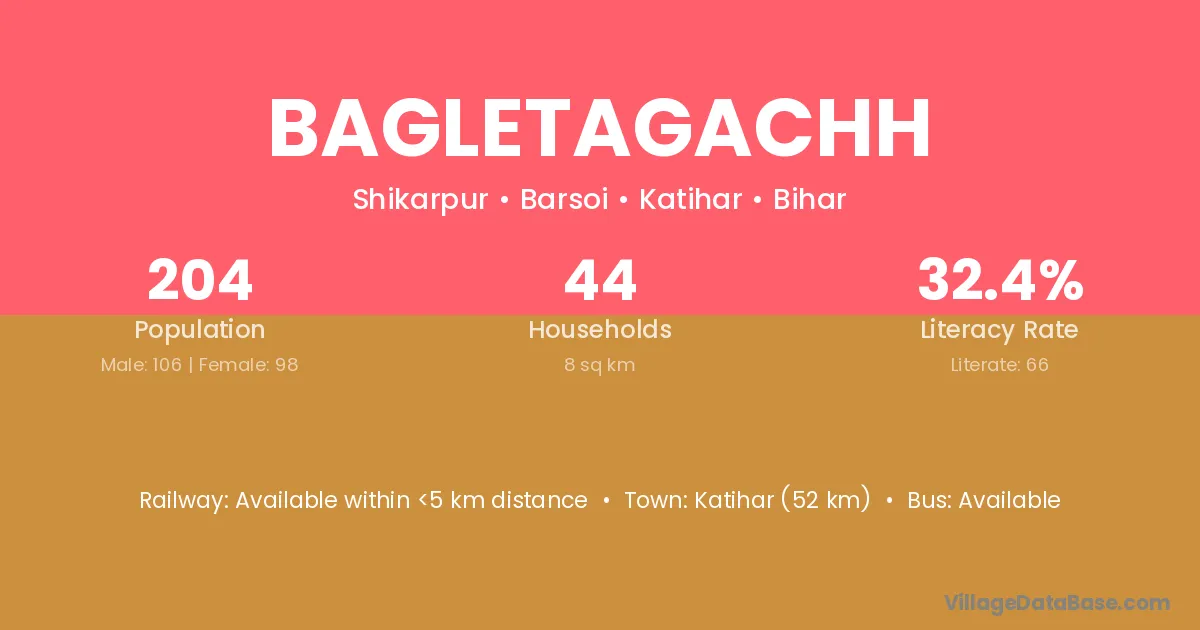 Katihar (52 km) is the nearest town to Bagletagachh village for major economic activities and is located approximately 52 km away.
