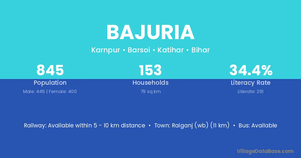 Bajuria village has a total population of 845 people, of which 445 are males and 400 are females.