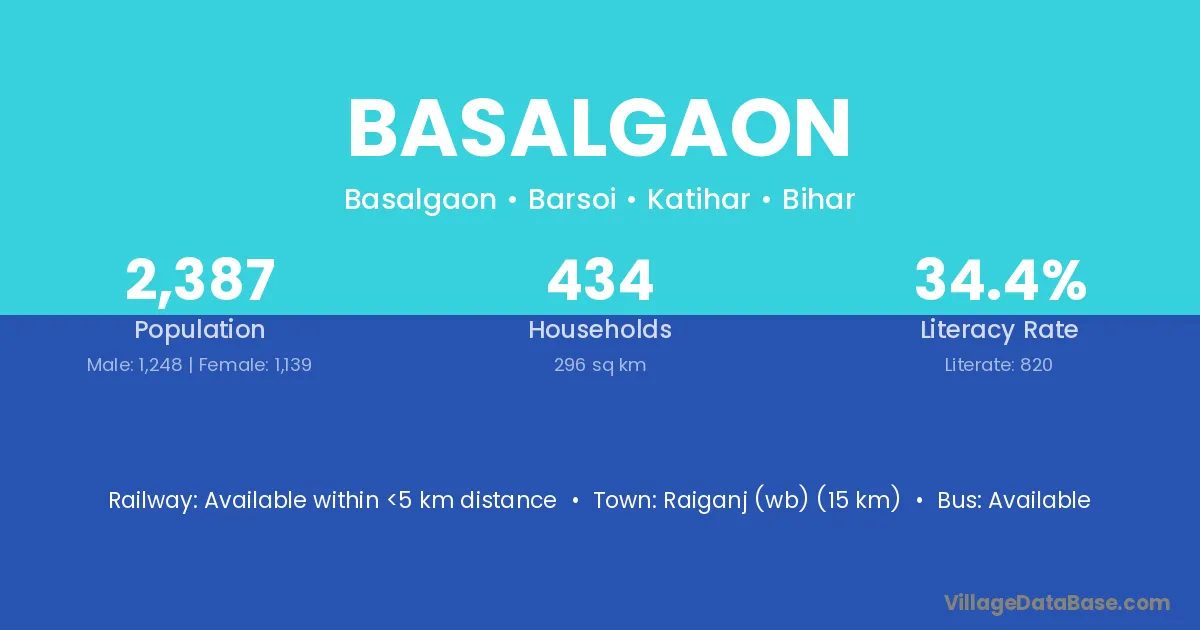 Raiganj (wb) (15 km) is the nearest town to Basalgaon village for major economic activities and is located approximately 15 km away.