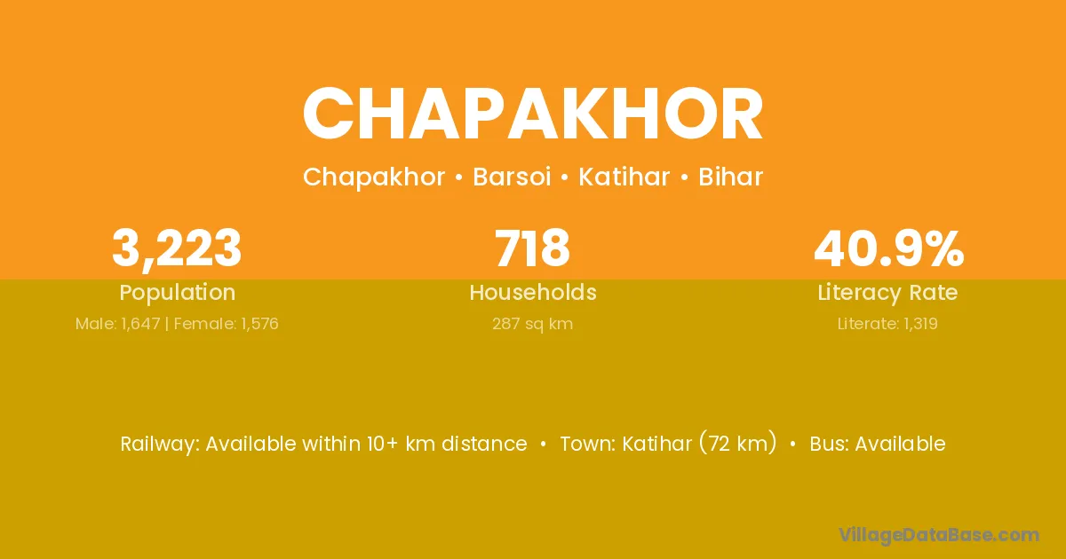 Katihar (72 km) is the nearest town to Chapakhor village for major economic activities and is located approximately 72 km away.