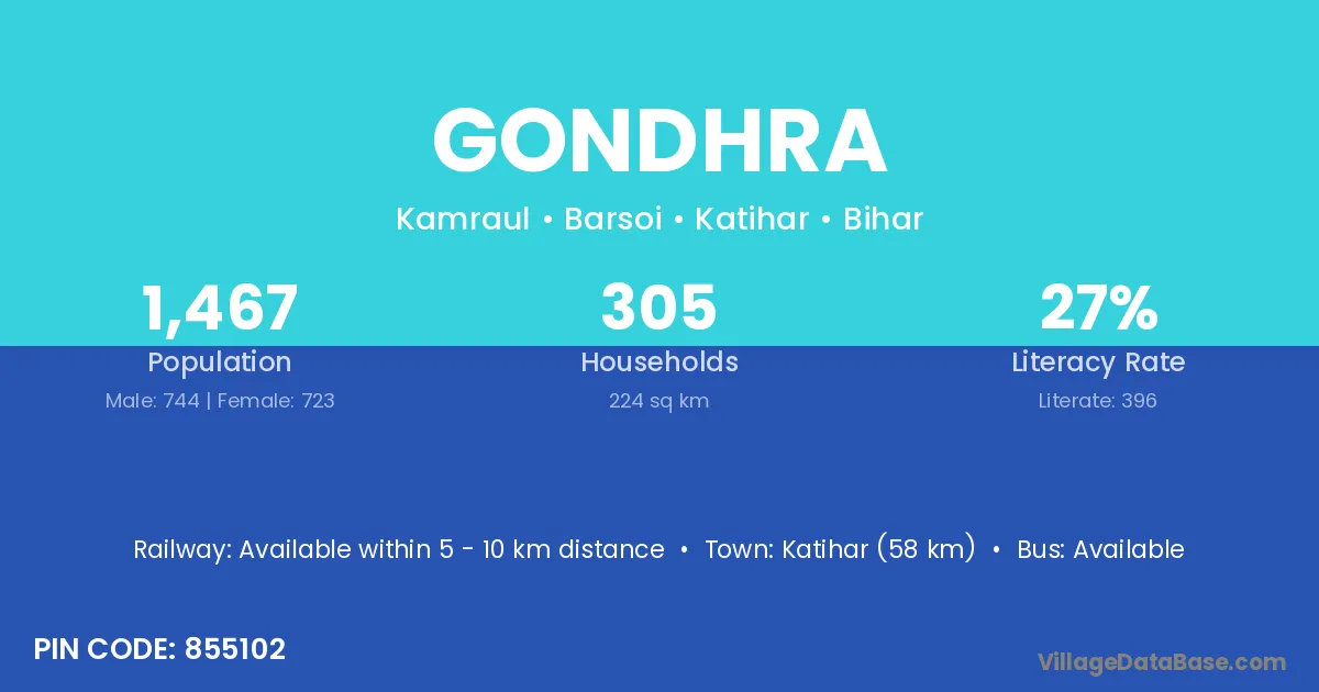 Katihar (58 km) is the nearest town to Gondhra village for major economic activities and is located approximately 58 km away.