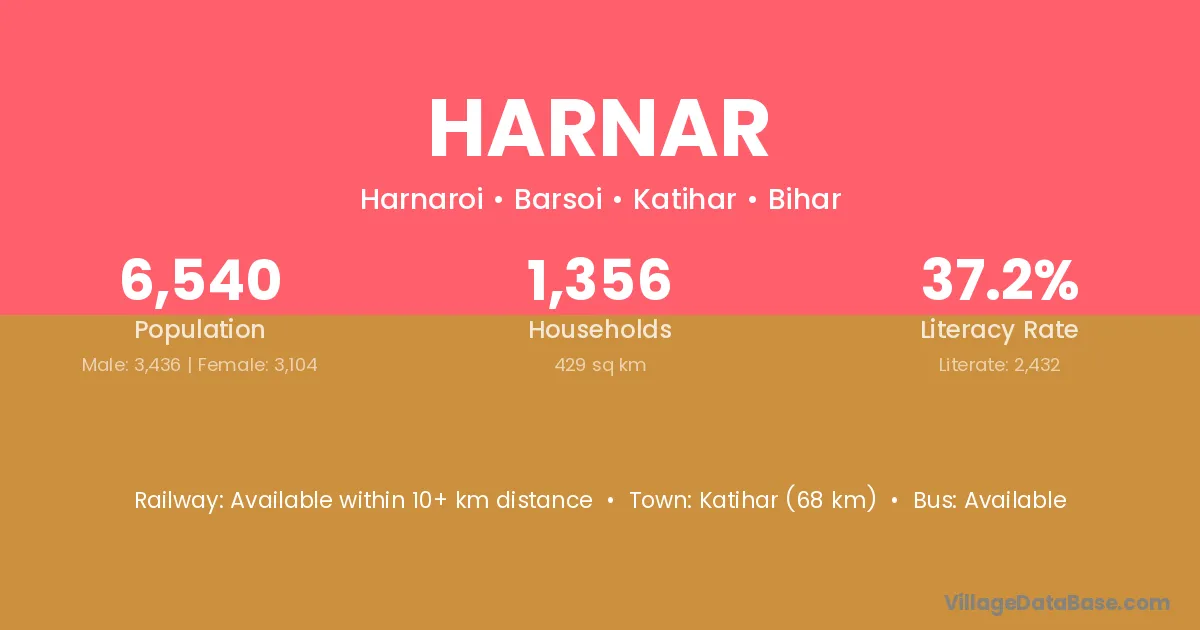 Katihar (68 km) is the nearest town to Harnar village for major economic activities and is located approximately 68 km away.
