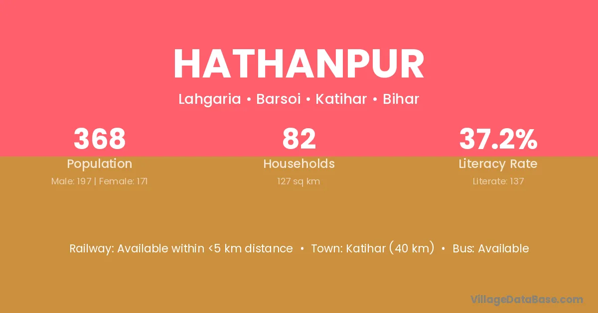 Katihar (40 km) is the nearest town to Hathanpur village for major economic activities and is located approximately 40 km away.