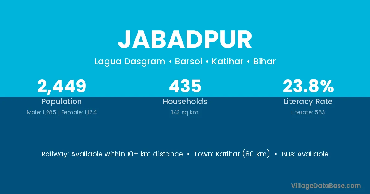 Katihar (80 km) is the nearest town to Jabadpur village for major economic activities and is located approximately 80 km away.