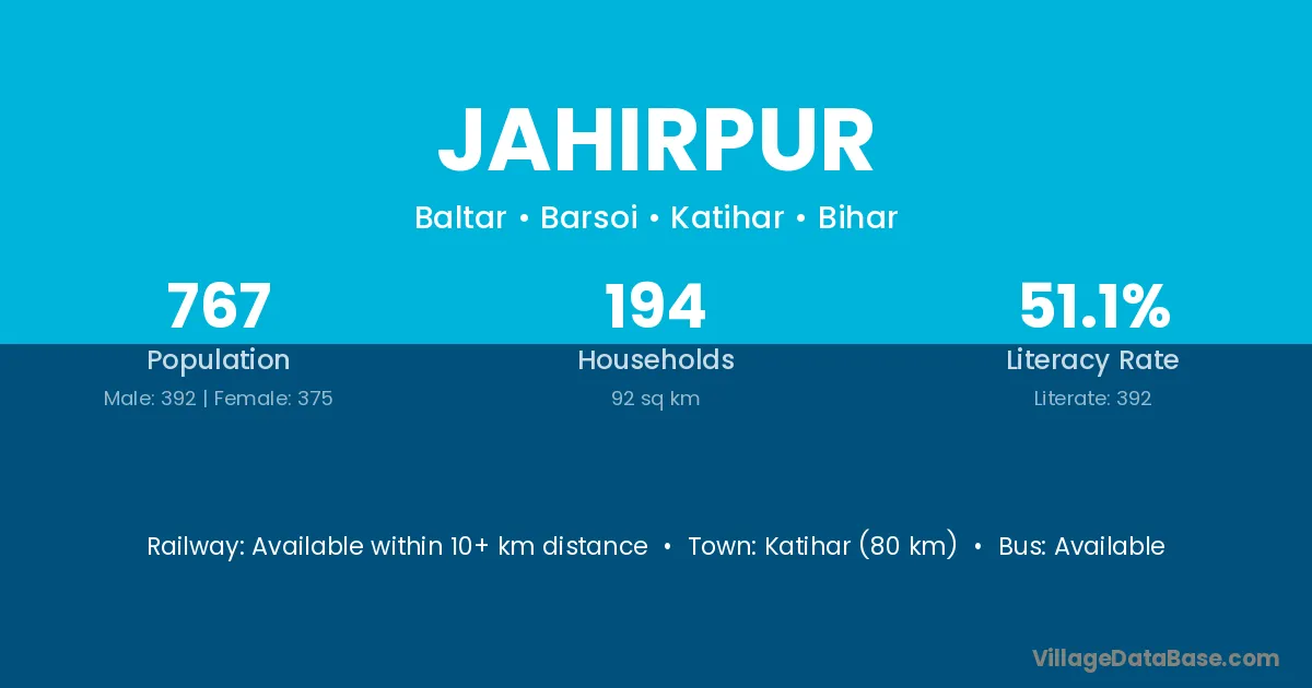 Katihar (80 km) is the nearest town to Jahirpur village for major economic activities and is located approximately 80 km away.