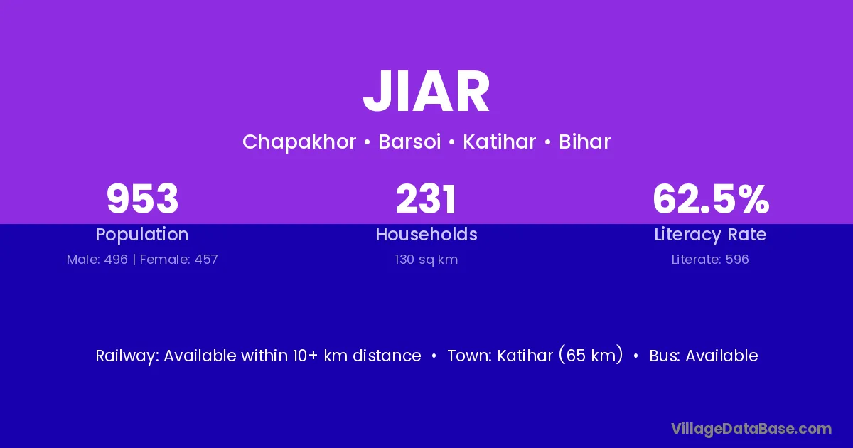 Katihar (65 km) is the nearest town to Jiar village for major economic activities and is located approximately 65 km away.