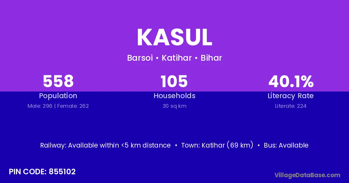 Katihar (69 km) is the nearest town to Kasul village for major economic activities and is located approximately 69 km away.