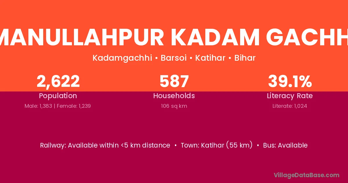 Katihar (55 km) is the nearest town to Manullahpur Kadam Gachhi village for major economic activities and is located approximately 55 km away.