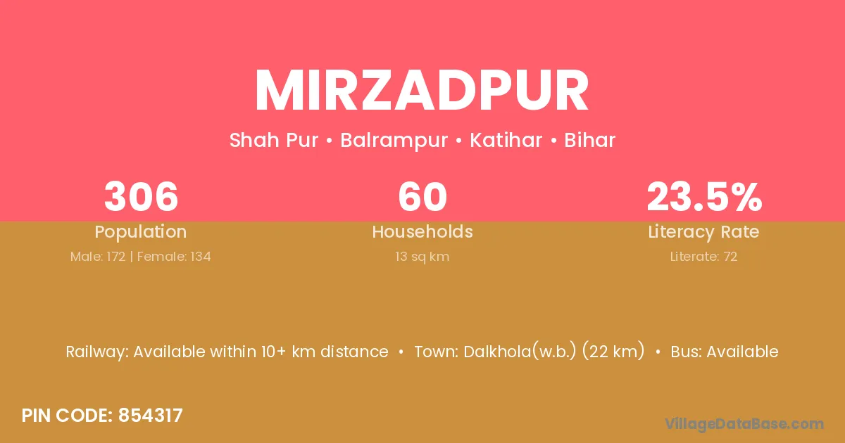 Raiganj (wb) (14 km) is the nearest town to Mirzadpur village for major economic activities and is located approximately 14 km away.