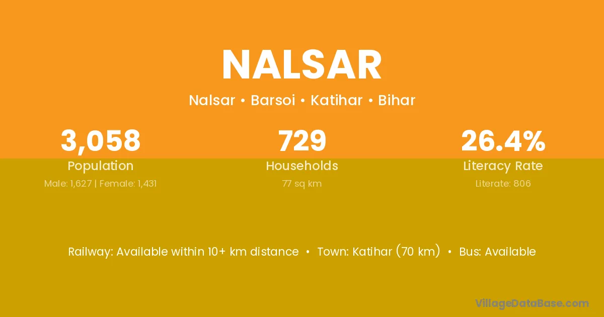Katihar (70 km) is the nearest town to Nalsar village for major economic activities and is located approximately 70 km away.