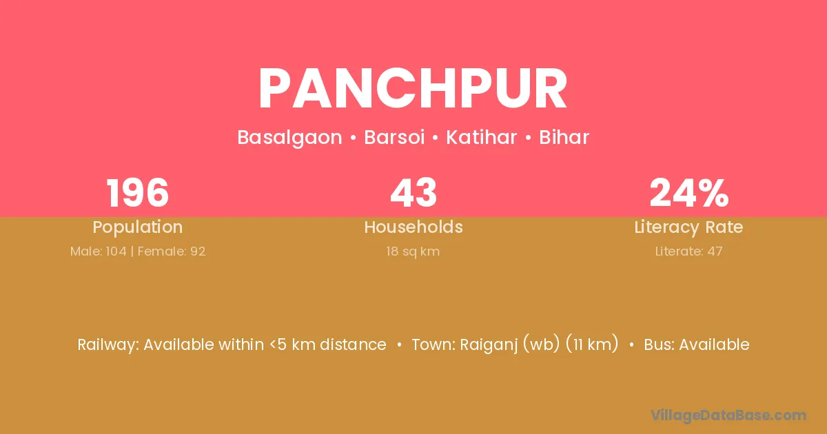 Raiganj (wb) (11 km) is the nearest town to Panchpur village for major economic activities and is located approximately 11 km away.