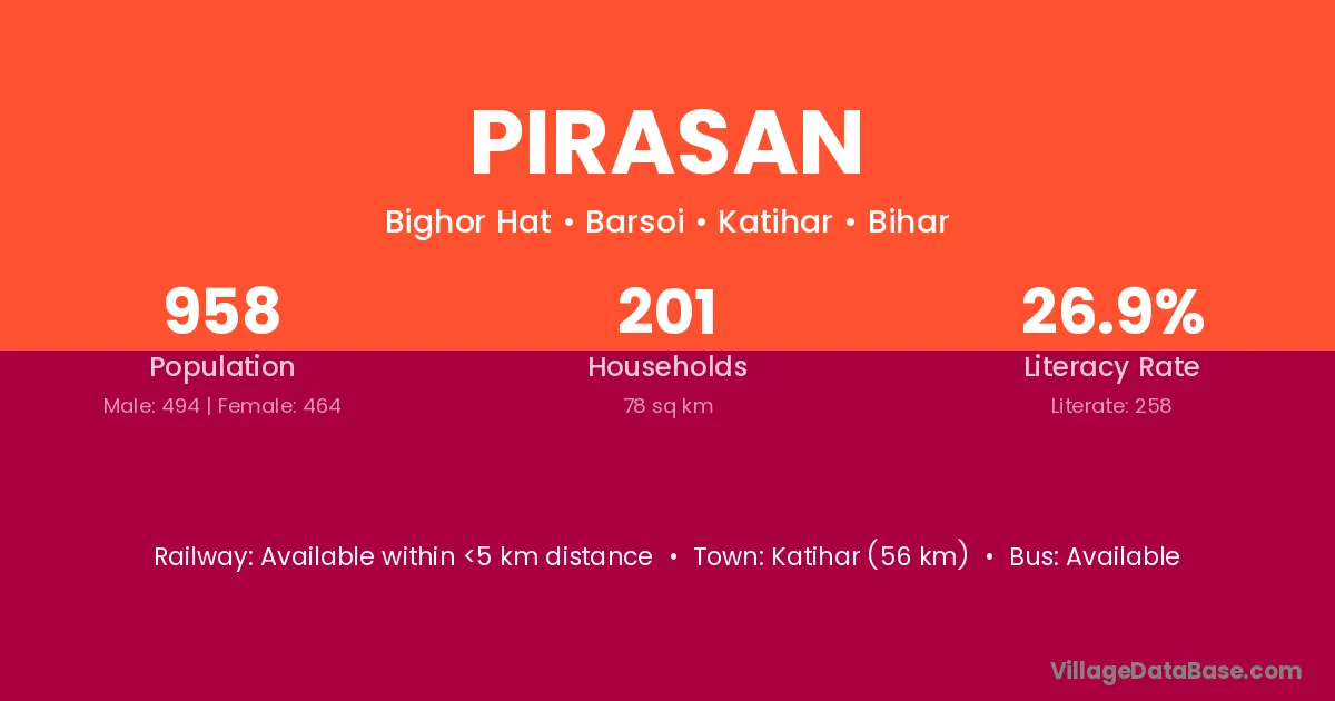 Katihar (56 km) is the nearest town to Pirasan village for major economic activities and is located approximately 56 km away.