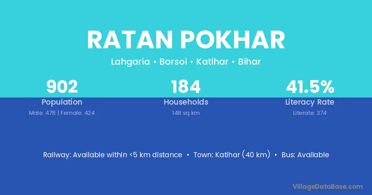 Katihar (40 km) is the nearest town to Ratan Pokhar village for major economic activities and is located approximately 40 km away.