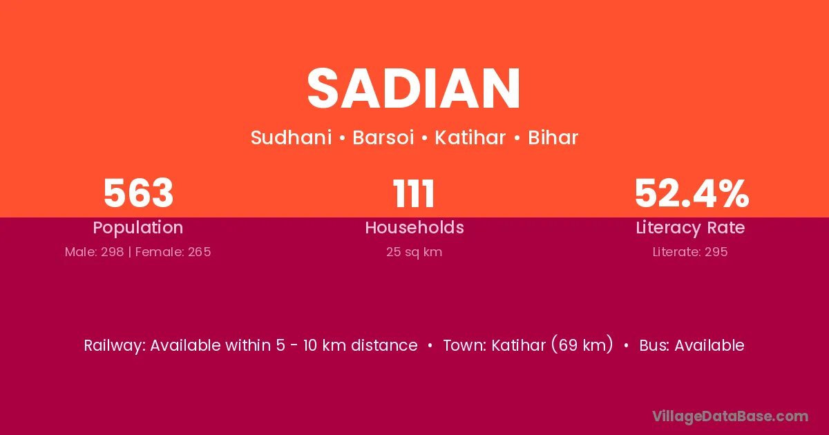 Katihar (69 km) is the nearest town to Sadian village for major economic activities and is located approximately 69 km away.